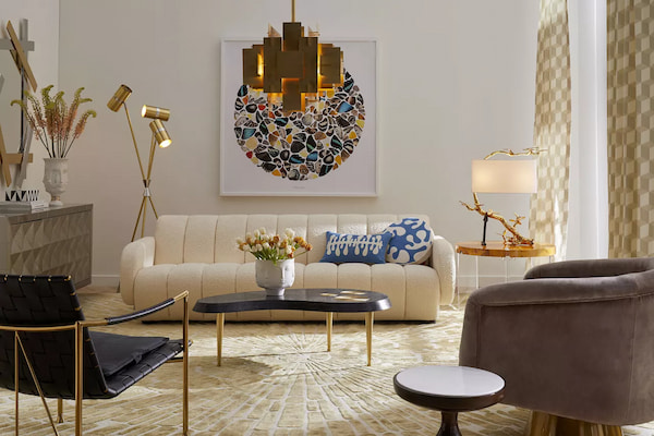 Phòng khách có xu hướng không có điểm nhấn do có nhiều hoạt động diễn ra ở đó. Hãy đặt giữa một chiếc đèn chùm hoặc đèn mặt dây trên bàn hoặc chiếc ghế đẩu để có một cái nhìn cân đối và dễ chịu về mặt thị giác.