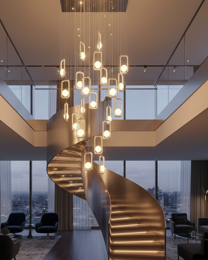 - Hình khối: Thiết kế đối xứng, cân bằng thị giác. Dáng đèn thả dài theo trục đứng, tạo chiều sâu và sự thanh thoát cho không gian thông tầng